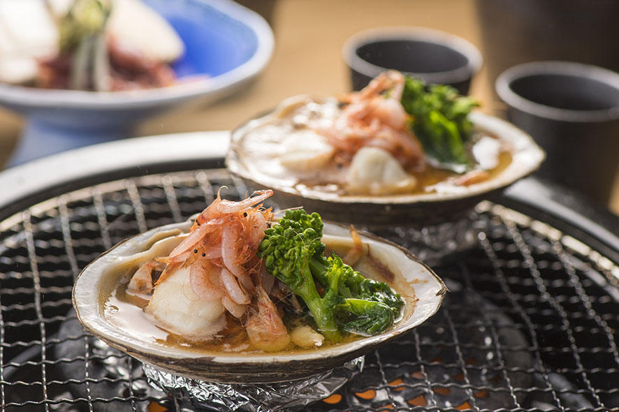 桜海老と虎ふぐを出汁とともにじっくり殻焼きいたしました。